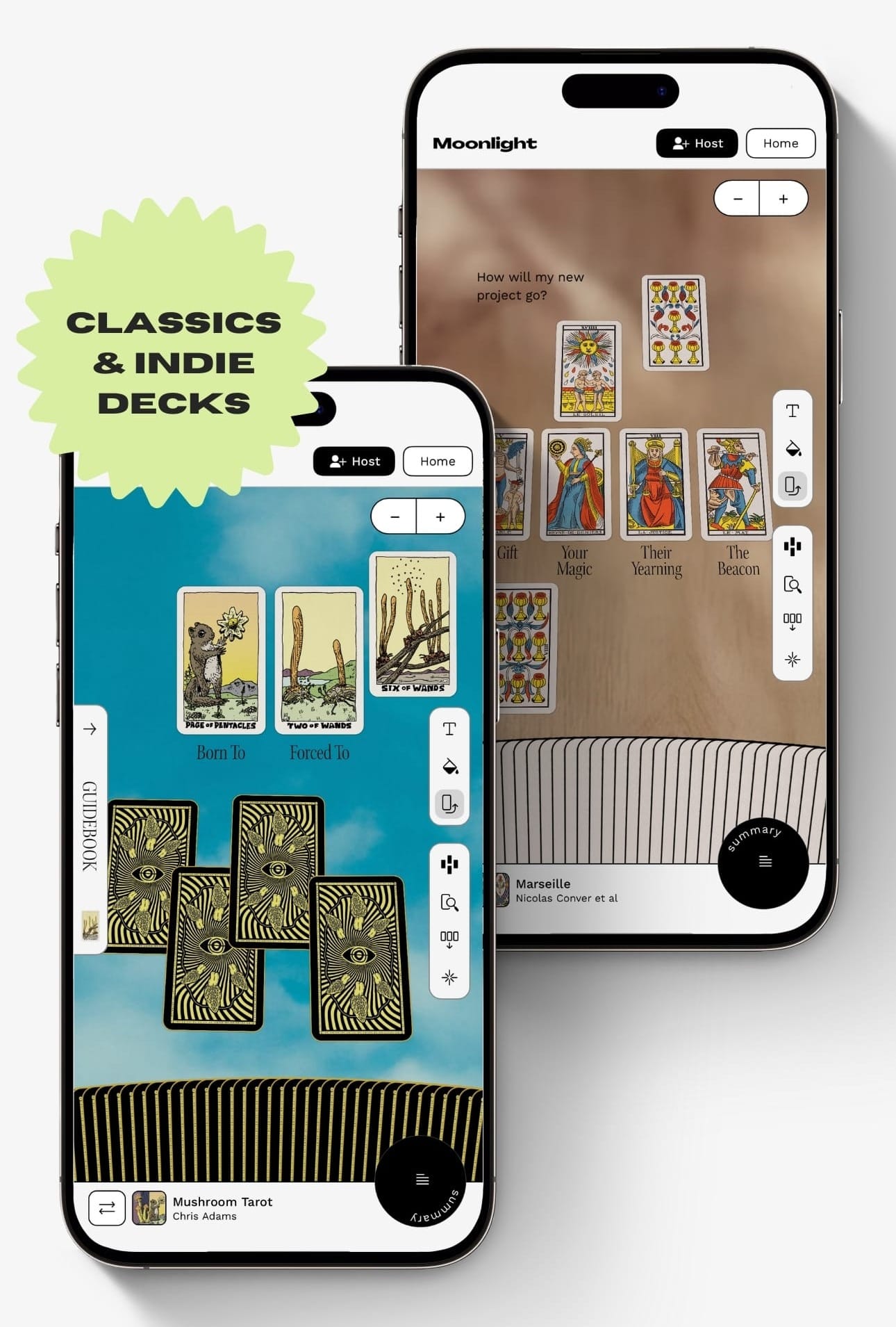 One of the things we love about building Moonlight is our partnerships with amazing indie deck artists. We’re thrilled to host decks like Gothmancy, Viator Somniorum, Mushroom Tarot, Eldritch Overload, Solar Kingdom, and more. We make carefully crafted digital experiences that honor the original artwork while taking advantage of what technology can offer. We even replicated digital holographic foil!